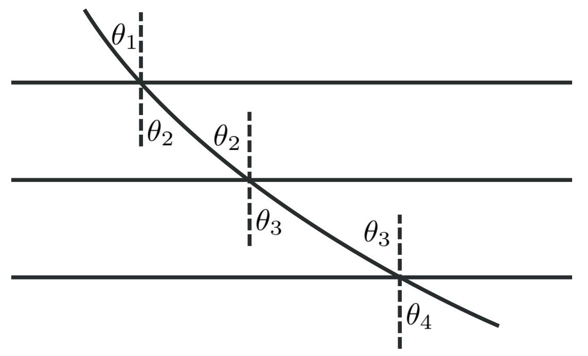 Newton’s solution was clever but it doesn’t provide any insights we’ll be interested in so we will focus on Bernoulli’s ingenious solution which starts, interestingly enough, with Snell’s Law of Refraction. He begins by considering the stratified medium in the following figure, where an object travels with velocities \(v_1, v_2, v_3, \ldots\) in the various layers.