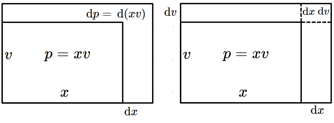 With this in mind, \(\dx{ p}=\dx{(xv)}\) can be thought of as the change in area when \(x\) is changed by \(\dx{ x}\) and \(v\) is changed by \(\dx{ v}\text{.}\) This can be seen as the L shaped region in the following drawing.