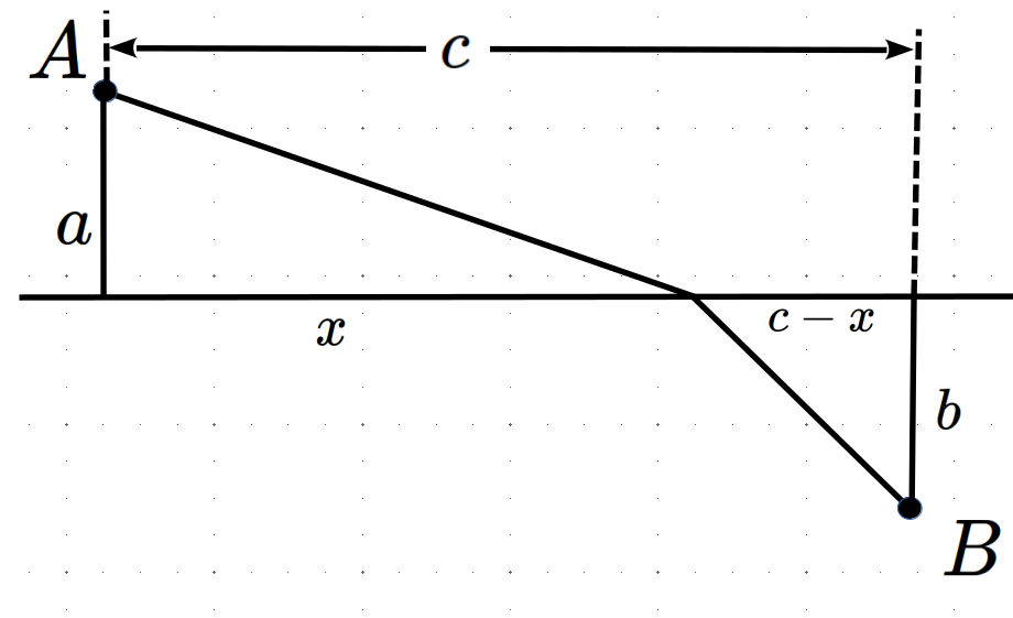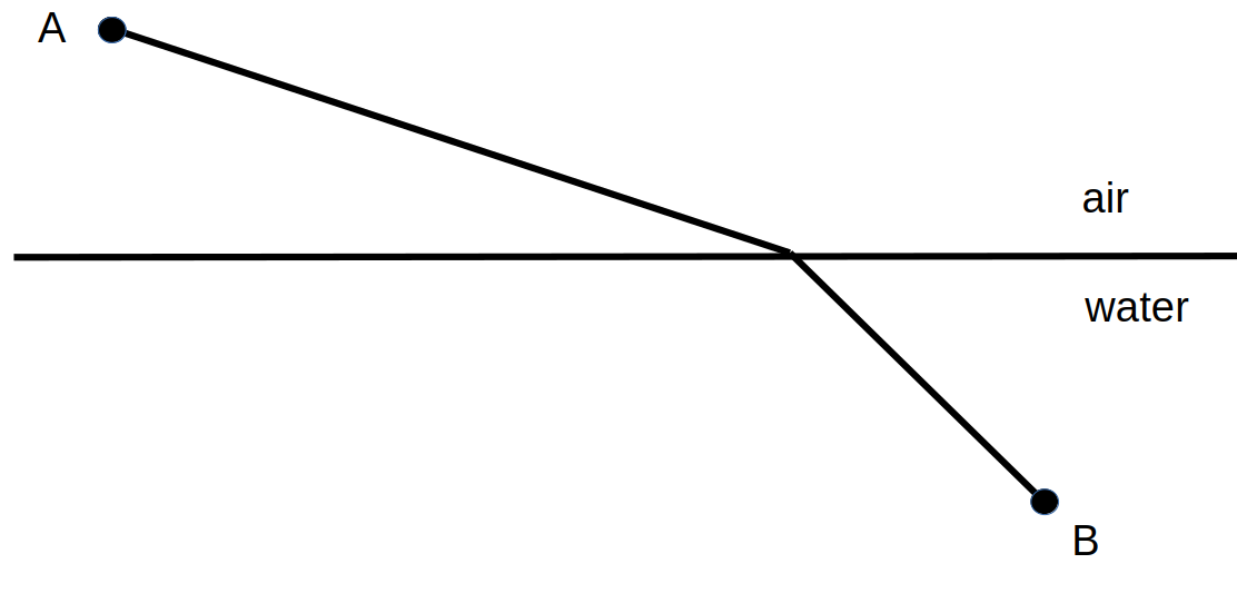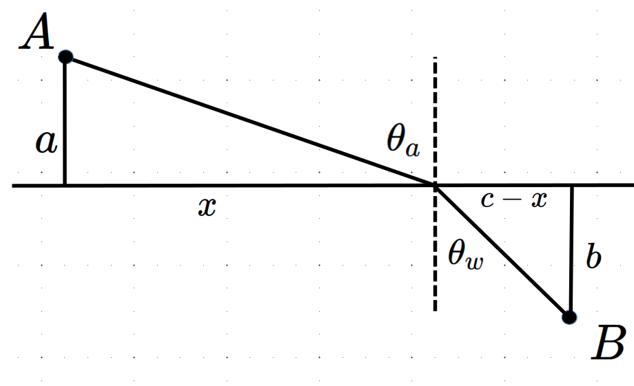 Given that light travels through air at a speed of \(v_a\) and travels through water at a speed of \(v_w\) the problem is to find the fastest path from point \(A\) to point \(B\text{.}\)