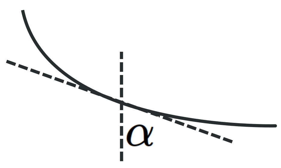 If we think of a continuously changing medium as stratified into infinitesimal layers and extend Snell’s law to an object whose speed is constantly changing, then along the fastest path, the ratio of the sine of the angle that the curve’s tangent makes with the vertical, \(\alpha\text{,}\) and the speed, \(v\text{,}\) must remain constant,