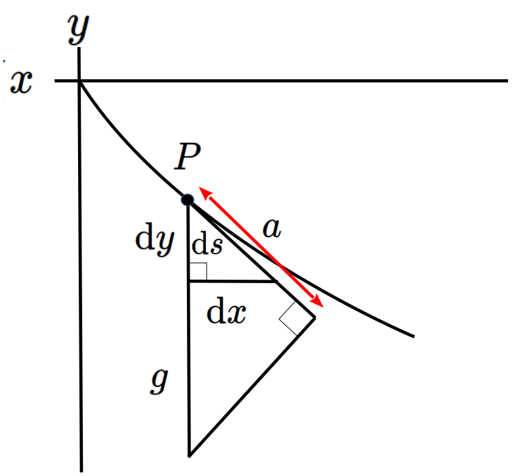 By similar triangles we have \(\frac{a}{g}=\frac{\dx{ y}}{\dx{ s}}\text{.}\) As a student of Leibniz, Bernoulli would have regarded \(\frac{\dx{ y}}{\dx{ s}}\) as a fraction so