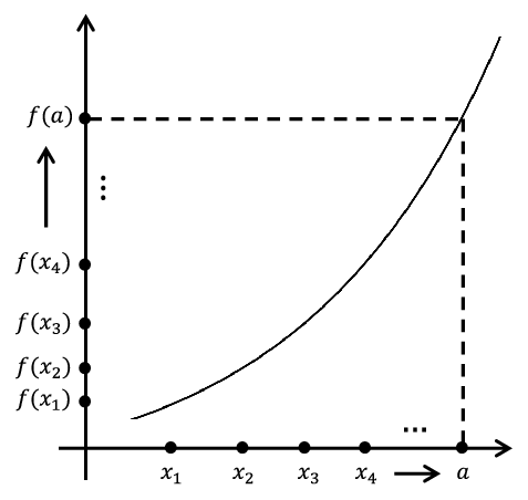 Theorem 8.2.1 says that in order for \(f\) to be continuous, it is necessary and sufficient that any sequence \(\left(x_n\right)\) converging to \(a\) must force the sequence \(\left(f(x_n)\right)\) to converge to \(f(a)\text{.}\) A picture of this situation is below though, as always, the formal proof will not rely on the diagram.