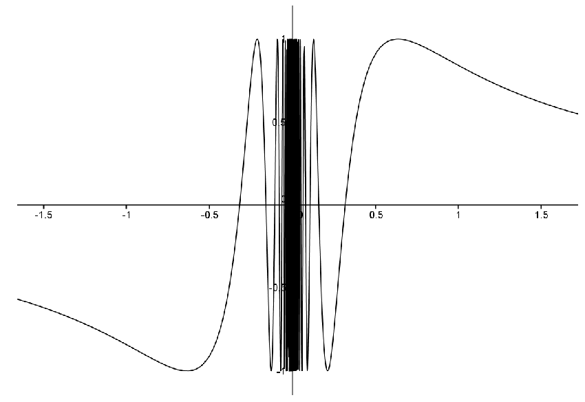 0\text{,}\) and oscillates infinitely often as \(x\) approaches zero. A rendition of the graph follows.