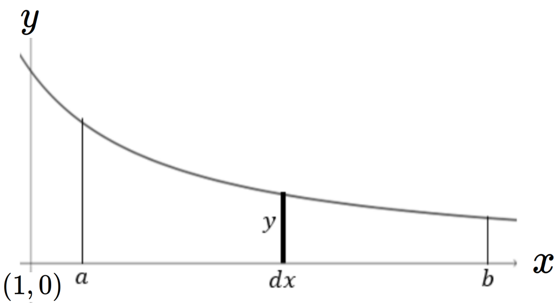 Notice that equation (10.3.1) states that two differentials are equal. Thus it seems apparent that if we add (integrate) together all such differentials between \(x=a\) and \(x=b\) we have (again employing Leibniz’ notation)
