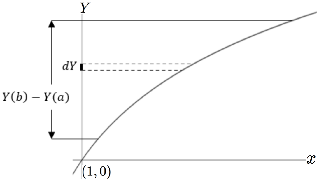 In Figure 10.3.1 the area of the infinitely thin rectangle on the left is given by \(y\dx{x}\) and is numerically equal to the infinitely small length \(\dx{Y}\) on the right. Adding the areas on the left gives the area under the curve \(y(x)\) between \(a\) and \(b\text{.}\) The sum of the lengths on the right gives the length of the line segment, also between \(Y(a)\) and \(Y(b)\text{:}\)\(Y\left(b\right)-Y(a)\text{.}\)
