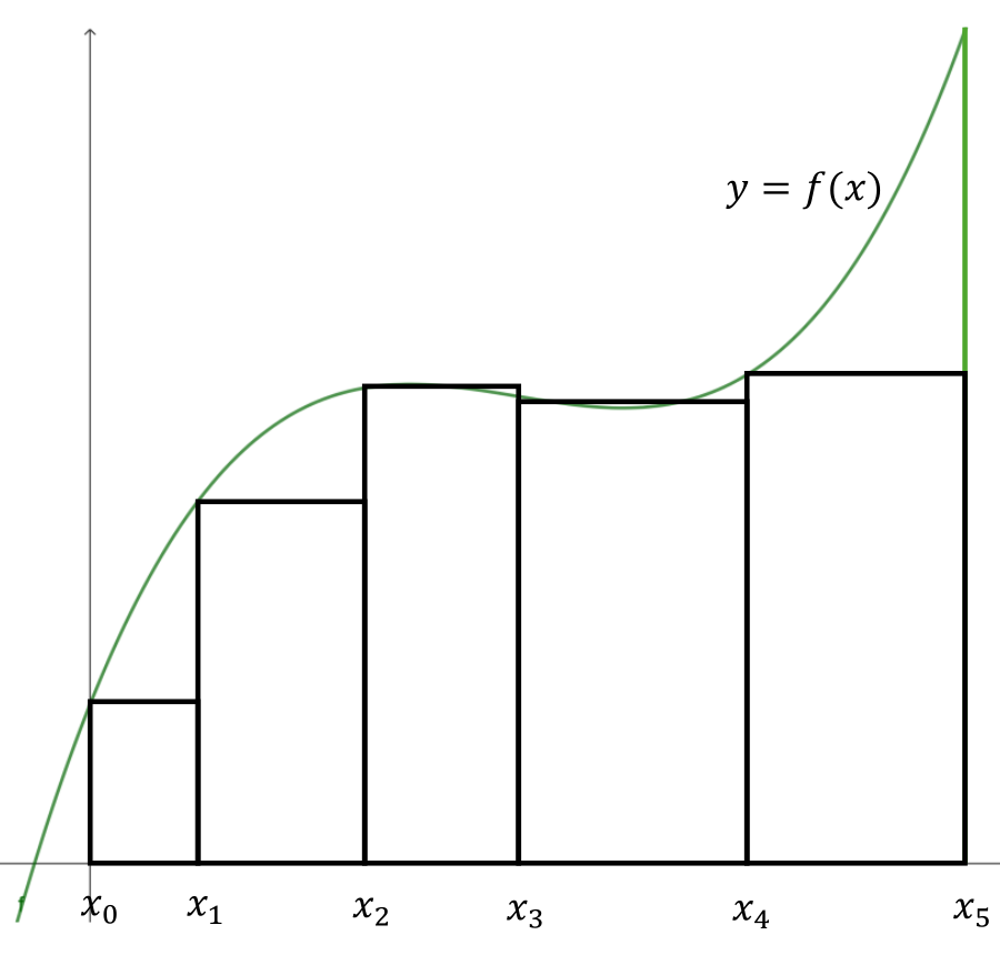If \(f\left(x\right)\ge 0\) as in Figure 10.4.1 we see that we are approximating the area under the curve \(y=f(x)\) with the area of a finite sum of boxes whose bases are the subintervals \([x_k,x_{k+1}]\) and whose heights are obtained by evaluating \(f\) at some point in \([x_k,x_{k+1}]\text{.}\) In our figure we used the left endpoint \(x_k\) for convenience. Notice that the subintervals need not be the same length.