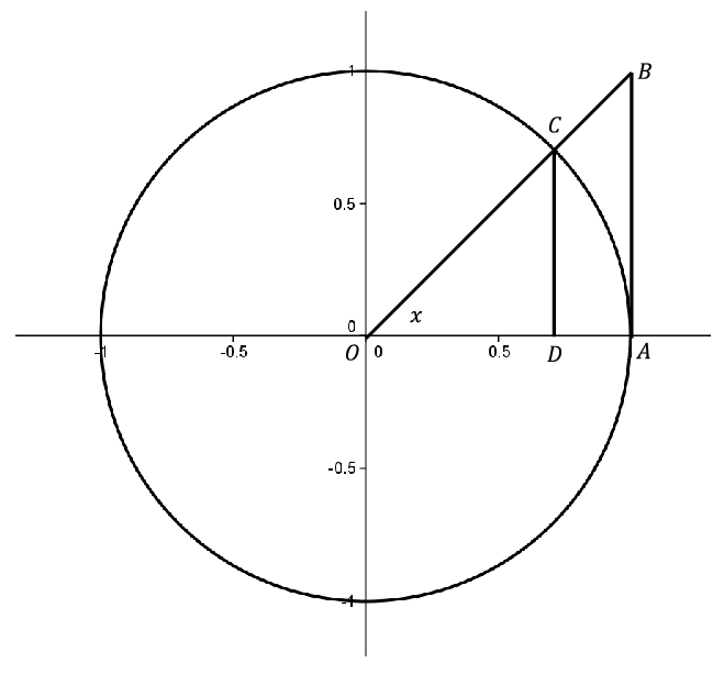 Returning to Example 10.1.1 we see that the Squeeze Theorem is just what we need. First notice that since \(D(x)=\frac{\sin x}{x}\) is an even function, we only need to focus on \(x\gt0\) in our inequalities. Consider the unit circle seen in Figure 10.1.15.