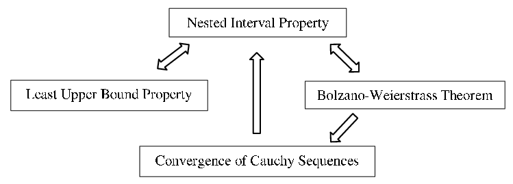 Problem 11.2.18 tell us that the following are equivalent: the Nested Interval Property, the Bolzano–Weierstrass Theorem, the Least Upper Bound Property, and the convergence of Cauchy sequences. Thus any one of these could have been taken as the completeness axiom of the real number system and then used to prove the each of the others as a theorem according to the following dependency graph: